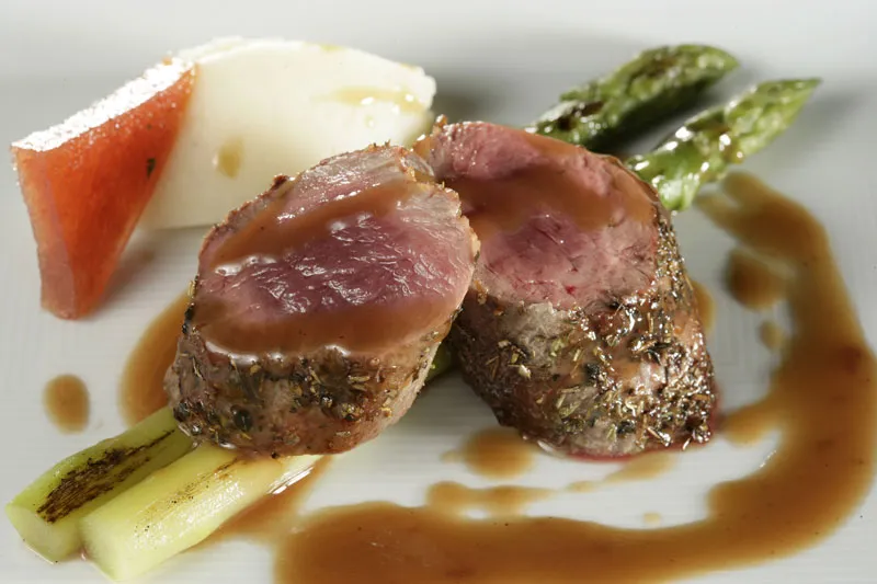 Conocido por la excelente calidad de sus setas, así como los patos derivados de la caza y las trufas de temporada, entre sus especialidades destacan el arroz cremoso de calamar y gambas, el san Pedro al horno con patata y cebolla gratinada al romero, el salteado de vieiras y alcachofas naturales con reducción de vinagre cabernet o el civet de jabalí.